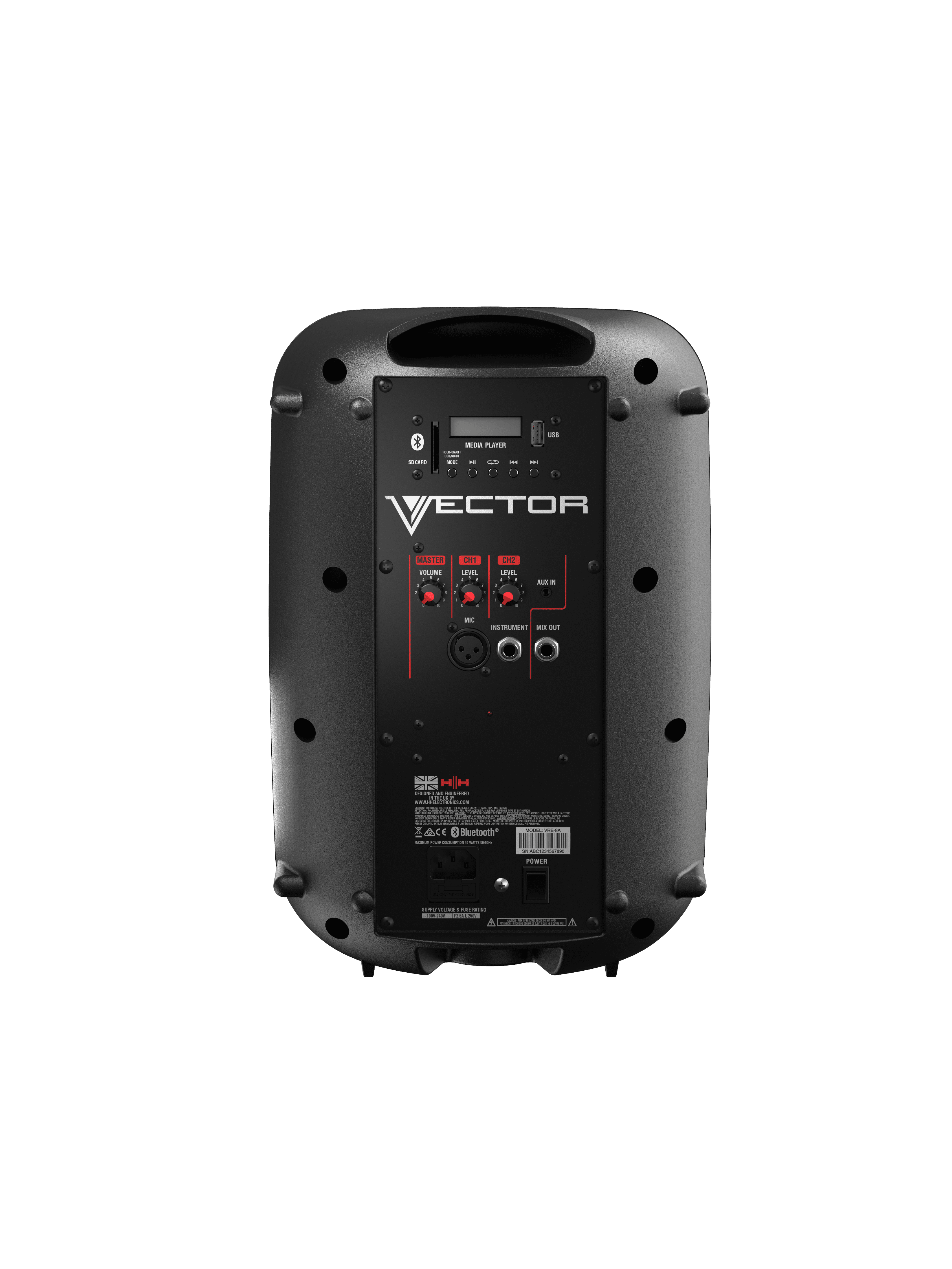 The Vector VRE-8A 8” 2-way active enclosure; the ideal compact and portable loudspeaker loaded with essential features. With 90 watts of high performance Class D amplification, the VRE-8A offers impressive SPL of up to 111dB making it an ideal solution for conference address or instrument amplification. The incorporated 2 channel mixer allows for direct connection via microphone, instrument and audio devices such as mobile phones and tablets. In addition, the VRE-8A comes equipped with an on-board media player consisting of USB, SD card and Bluetooth ®, allowing for wireless audio playback or backing tracks.