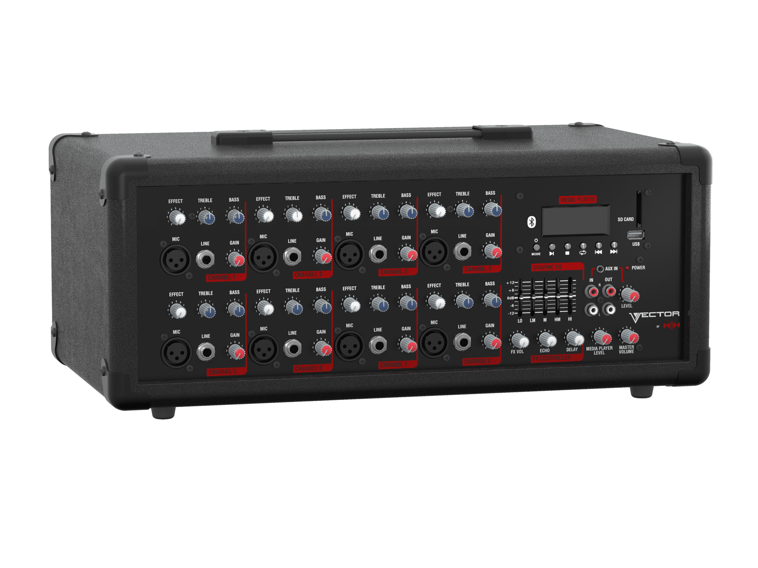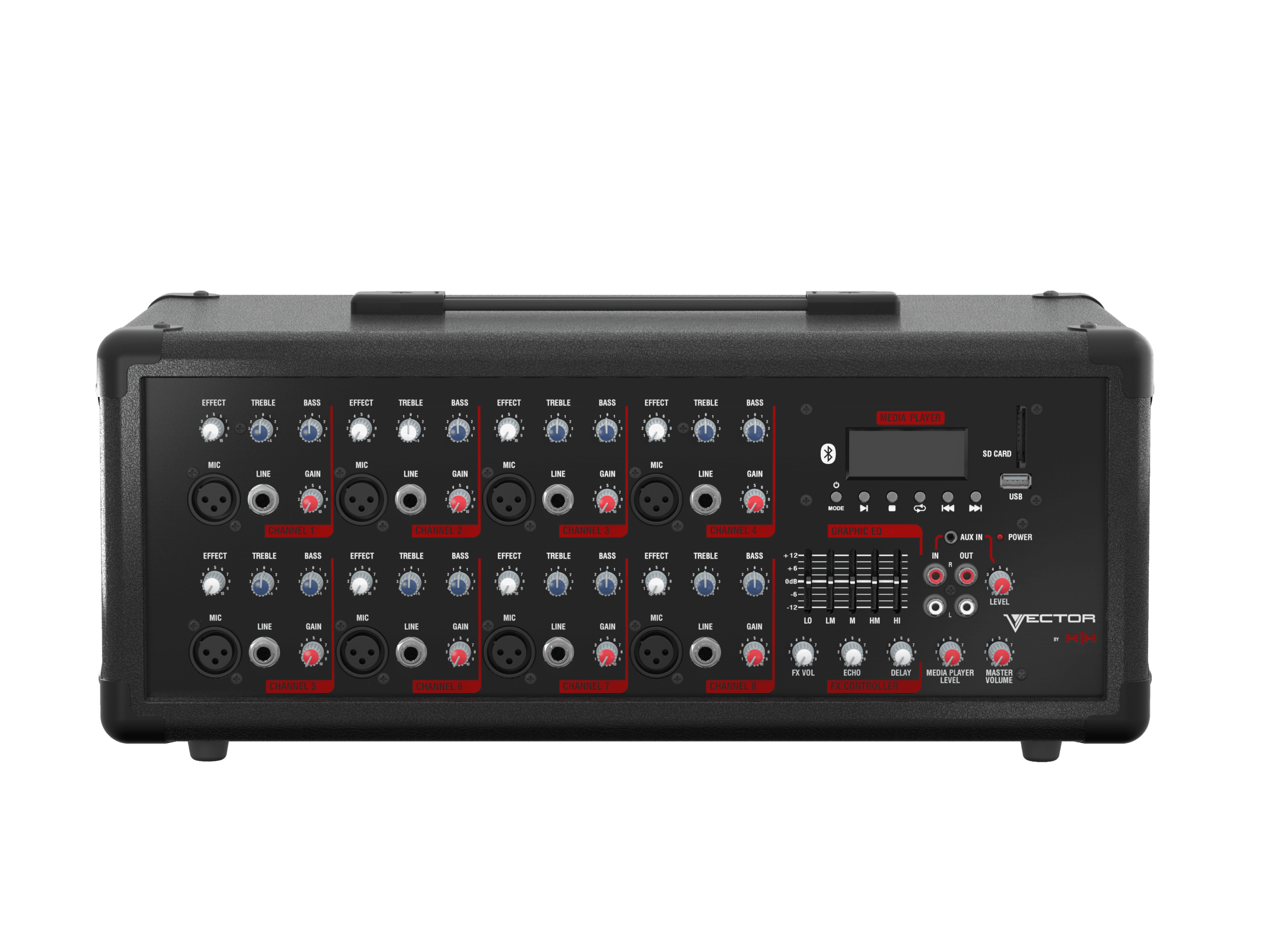 8 Channel mixer with mic/line inputs, EQ, on-board echo and delay (footswitchable), media player inc bluetooth, 5 band master EQ, FX loop, Aux in, Mix out and master volume