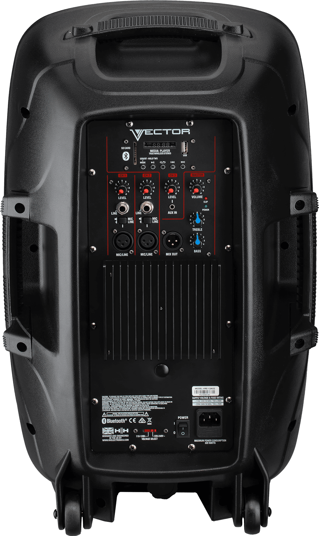 The VRE-12AG2 is the ideal audio solution for bands, conference, fitness, education, audio playback, DJ and more. With the integrated 3 channel mixer and the ability to connect microphones directly, users can use the VRE-12AG2 without the need for an external mixing console. The on-board media player enables audio playback via USB, SD card and Bluetooth enabled devices such as mobile phones. With 800 watts of power output, the VRE-12AG2 can project to audiences up to 250 people. Thanks to true wireless speaker pairing technology, two VRE-12AG2 speakers can be linked wirelessly.