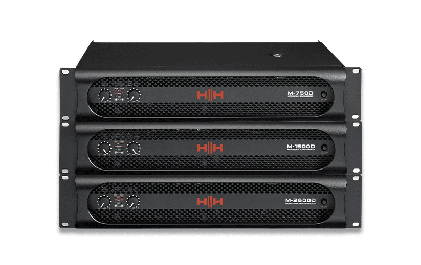 HH M-Series power amplifiers are high power, 2U rack amplifers designed to provide maximum performance for demanding applications. Three models are available all featuring heavy duty low noise toroidal power supplies and rugged construction.