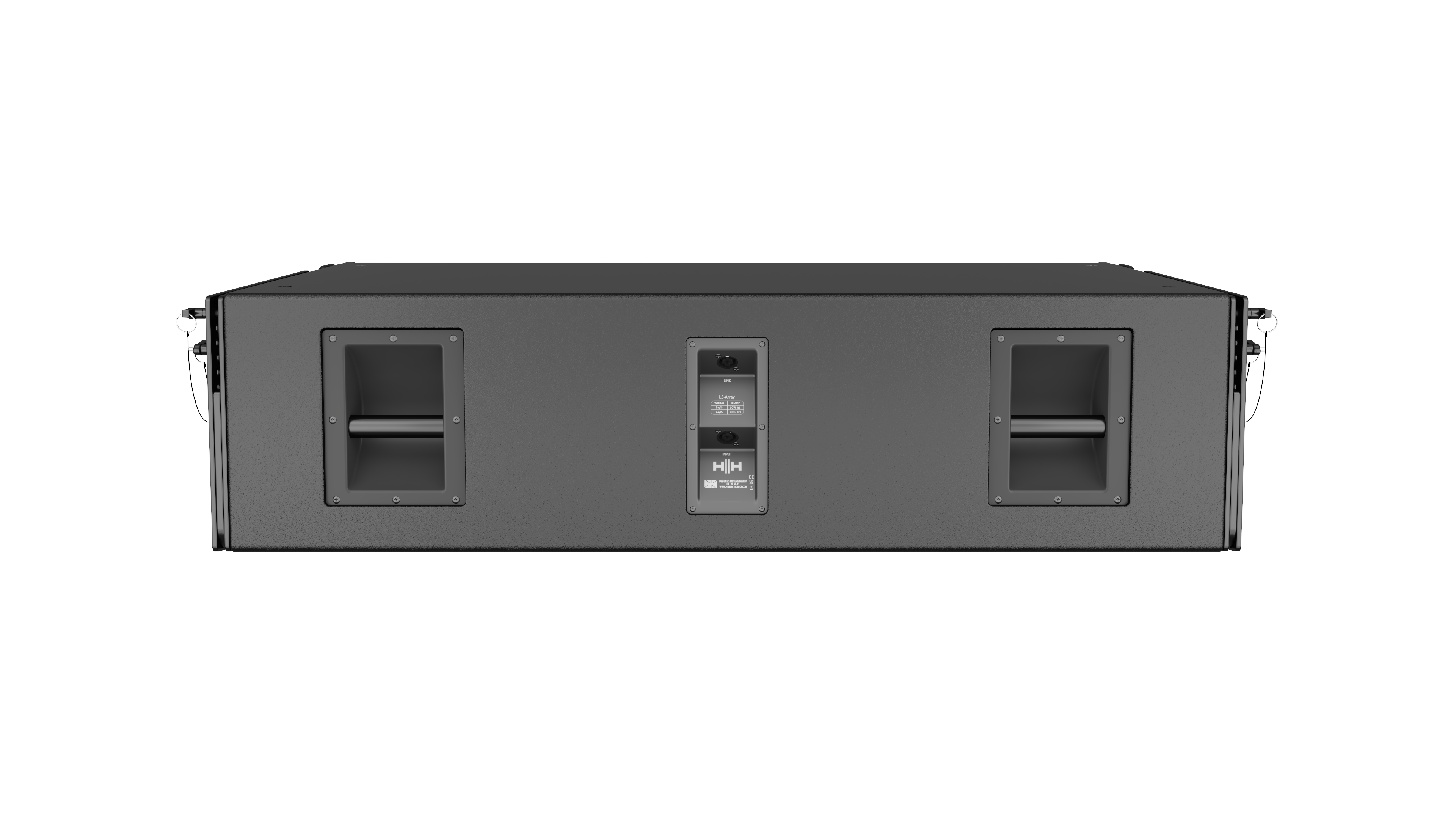 The L3-Array is a passive 2-way dual 12” line array loudspeaker that comprises 4 specially crafted drive units. 2 x 12” carbon fibre cone low-frequency drivers as well as 2 x 3” composite carbon fibre diaphragm tweeters combining to offer a maximum SPL of 146dB (Peak). The carbon fibre cones utilised in the 12” low-frequency drivers improve the overall transient response of the system, provide excellent phase response and perfect line source coupling resulting in a low-distortion high output system. The L3-Array has a frequency response of 60Hz – 19kHz (±3dB).